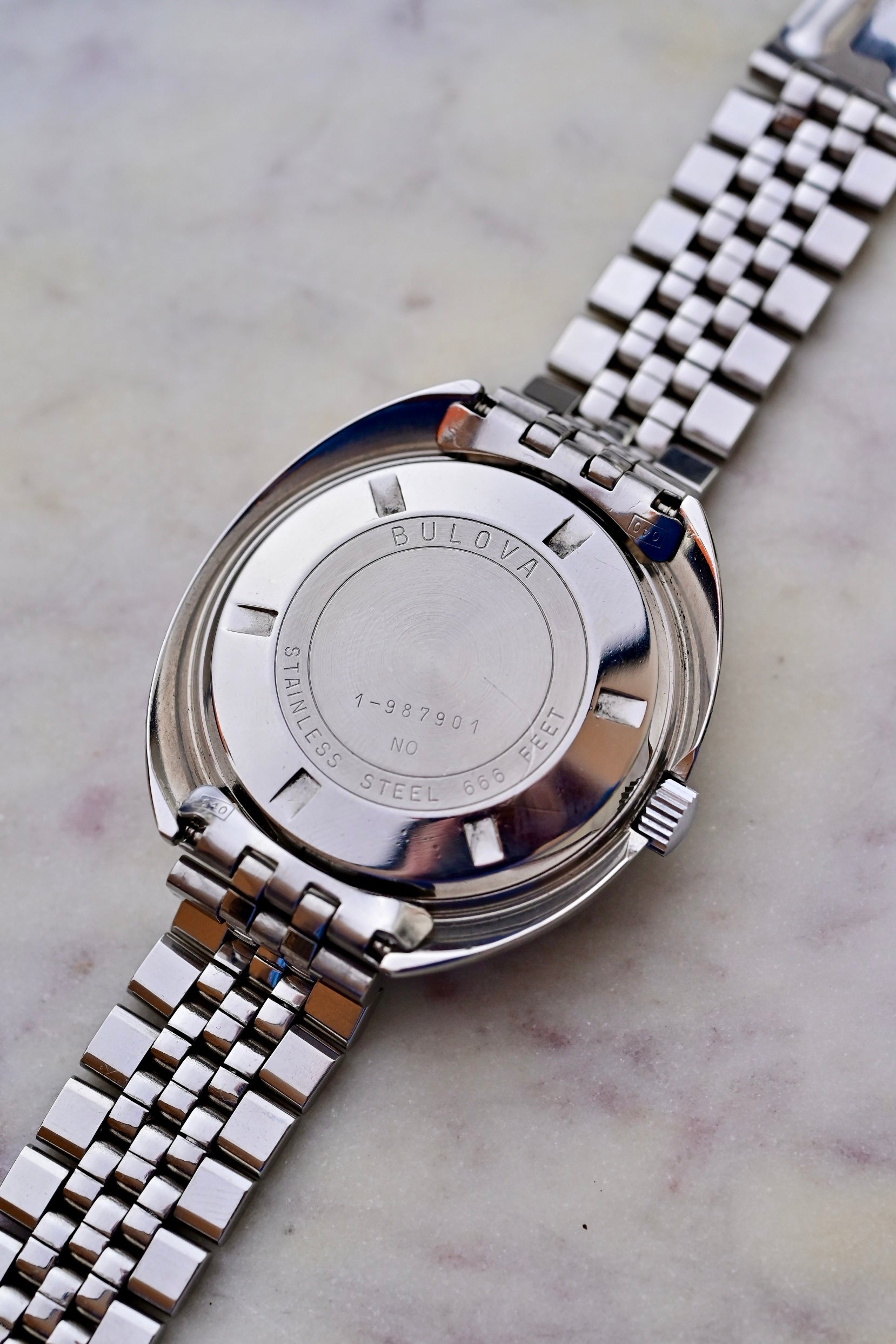 Cette “Devil Diver” doit son surnom à la mention “666 feet” sur son cadran noir mat, signé Singer (le même fabricant que pour certains cadrans Omega et Rolex Daytona). Le boîtier, quant à lui, provient de CBSA, réputé également pour la fabrication du boîtier de l’Omega Speedmaster. À l’intérieur bat le calibre automatique Bulova 11BLACD, un véritable mouvement maison de l’époque.