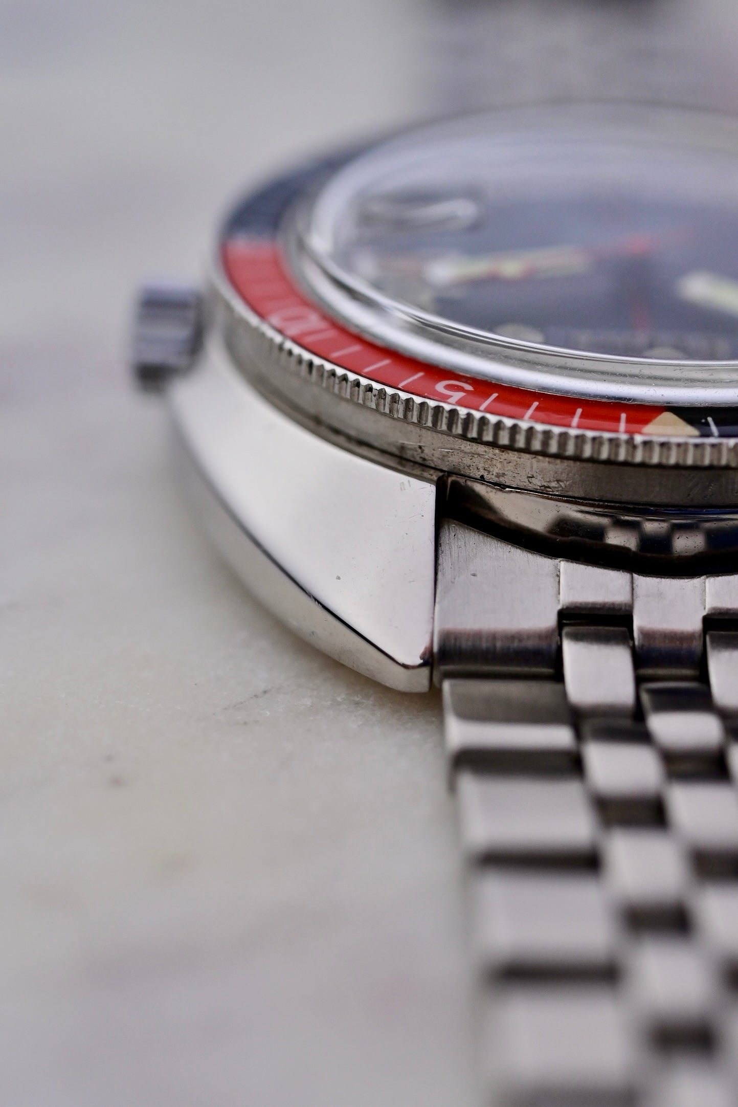 Une véritable icône parmi les montres de plongée vintage. Ses index en cristal appliqués, sertis dans un matériau semi-transparent, créent un relief et une présence visuelle que peu de montres peuvent égaler. Ajoutez à cela un design parfaitement équilibré, une palette de couleurs séduisante et cette superbe lunette en bakélite rouge et noire, ici dans un état remarquablement préservé et vous obtenez l’une des plongeuses les plus attachantes de la fin des années soixante.