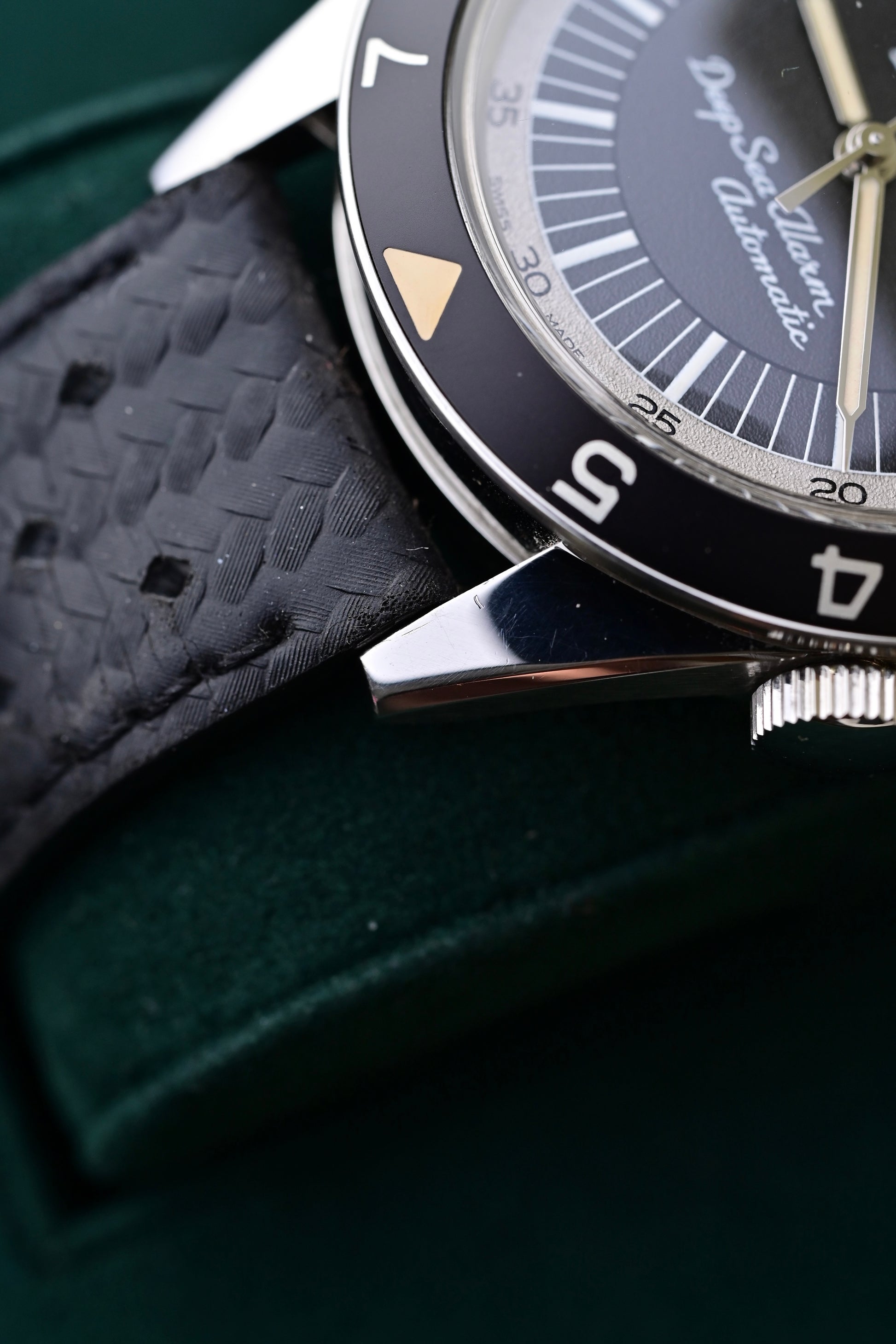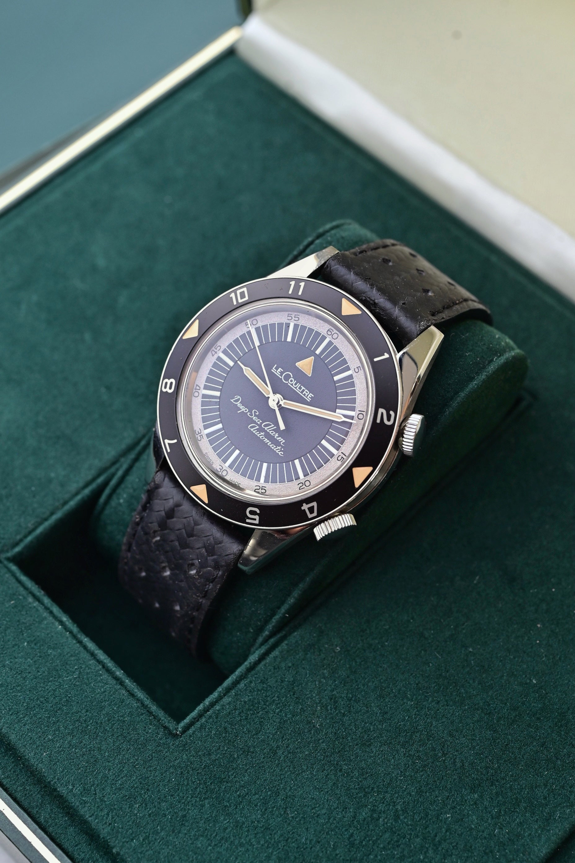 Produite à seulement environ 950 exemplaires entre 1959 et 1961, la Deep Sea originale est aujourd’hui extrêmement rare. Deux versions existaient déjà : une européenne signée Jaeger-LeCoultre, et une américaine estampillée LeCoultre, portant la mention « Deep Sea Alarm ».