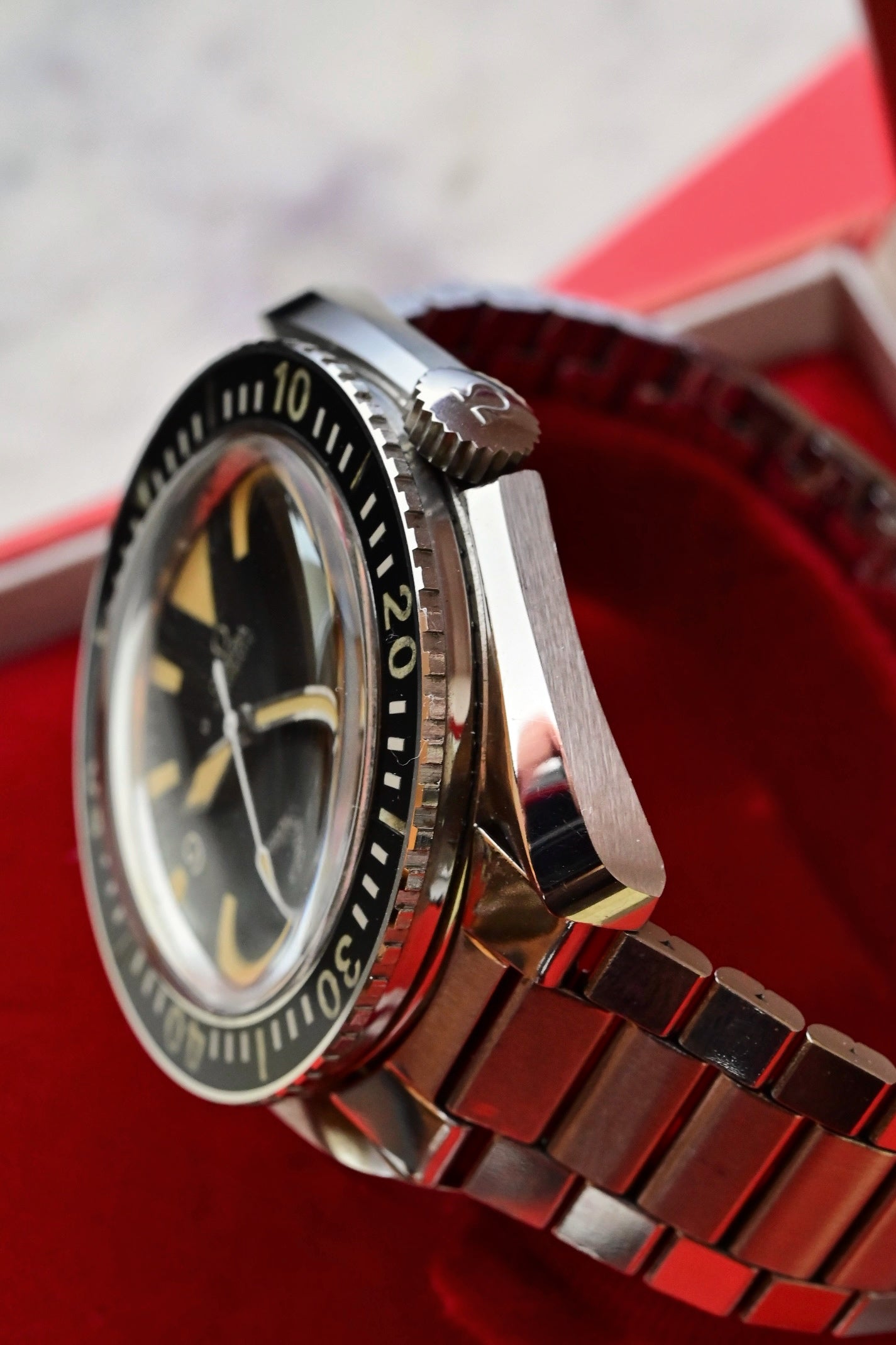 Son boîtier, à la fois robuste et élégant, est sublimé par la couronne "Naiad" à profil bas, signature des premiers modèles, avant l'adoption d'une couronne vissée répondant aux normes militaires de la fin des années 1960. Ces évolutions marquent l'histoire d'une montre conçue pour accompagner les professionnels dans les conditions les plus extrêmes.