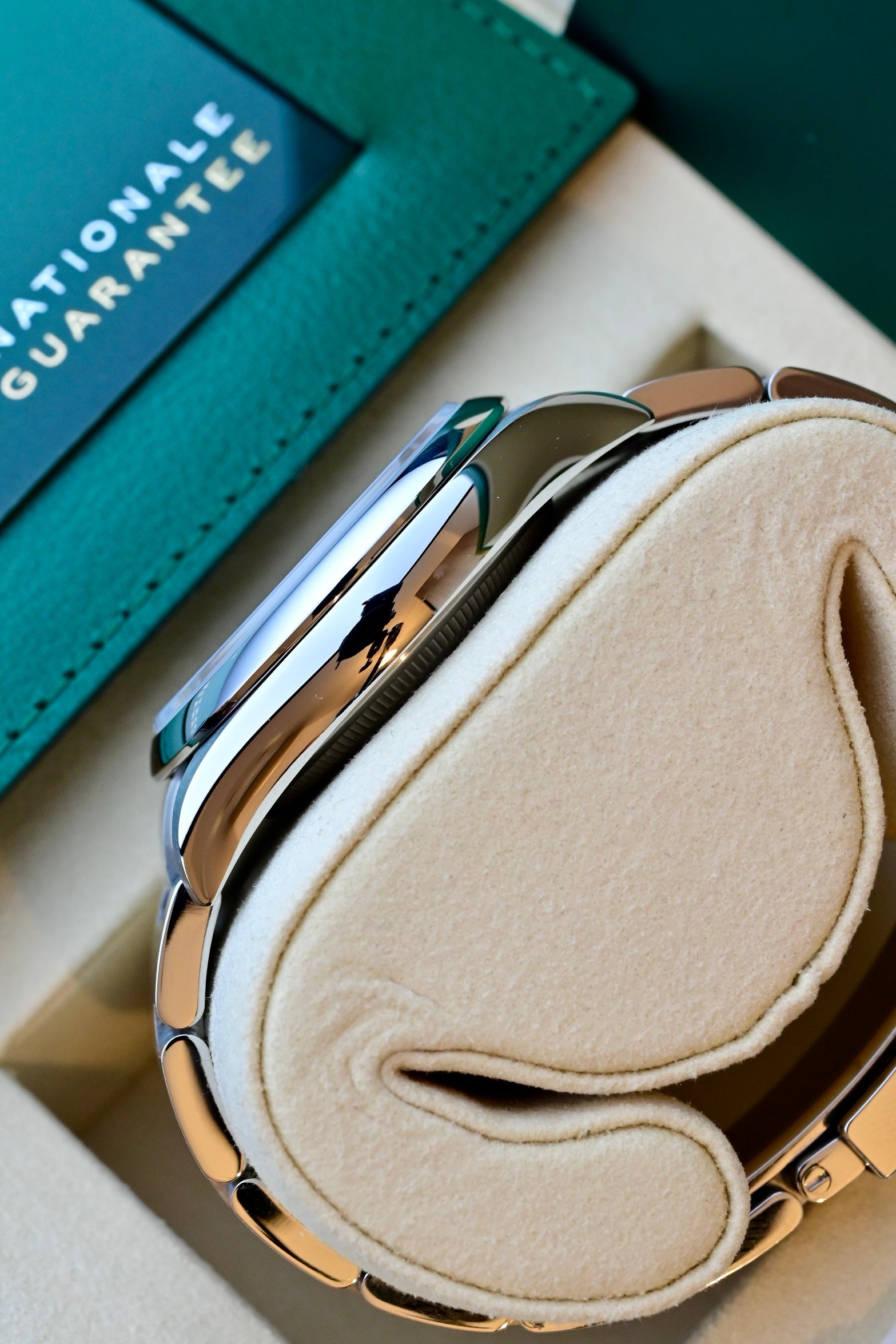 Le cadran vert constitue la signature forte de cette référence. Sa teinte profonde et lumineuse capte subtilement la lumière.